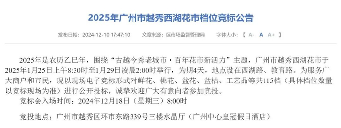 2025年是农历乙巳年,围绕“古越今秀老城市·百年花市新活力”主题,广州市越秀西湖花市于2025年1月25日上午8:30时至1月29日凌晨2:00时举行,为期4天,地点设在西湖路、教育路。