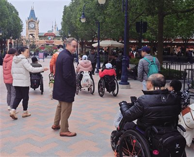 10时许,在迪士尼乐园安检主入口,记者遇到了组团前来游玩的特殊需要人士王先生和他的朋友们。“我知道,今天是迪士尼电动轮椅实施新规的第一天,我们也是专门挑了这一天来玩,想看一看是不是有所改善。”