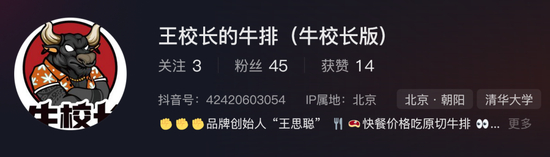 牛校长品牌隶属于北京牛校长餐饮服务有限公司,注册成立时间为2024年9月24日。王思聪旗下普思资本通过间接对外投资的形式获得了该公司超3.5%的股份。抖音账号“王校长的牛排(牛校长版)”发布了多条有关牛校长的短视频,其简介也显示,牛校长品牌的创始人为王思聪。