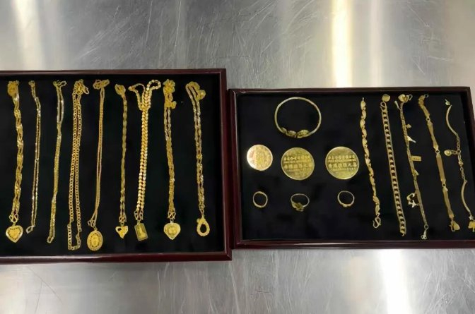 经进一步查验,海关关员在其行李箱内查获一个红色饰品袋,内有超量携带的疑似黄金制品22件,共计405.7克,总价约23万元。经专业机构鉴定,上述物品均为含量超99.9%足金制品。