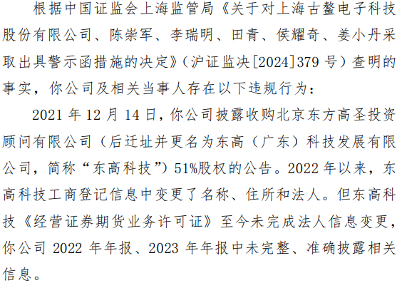 12月9日,因信息披露违规,古鳌科技(300551)及相关责任人收深交所监管函。由于所收购的子公司东高科技已变更名称、住所和法人,但其《经营证券期货业务许可证》至今未完成法人信息变更。因此,监管机构对古鳌科技、陈崇军、李瑞明、田青、侯耀奇、姜小丹采取出具警示函的措施。