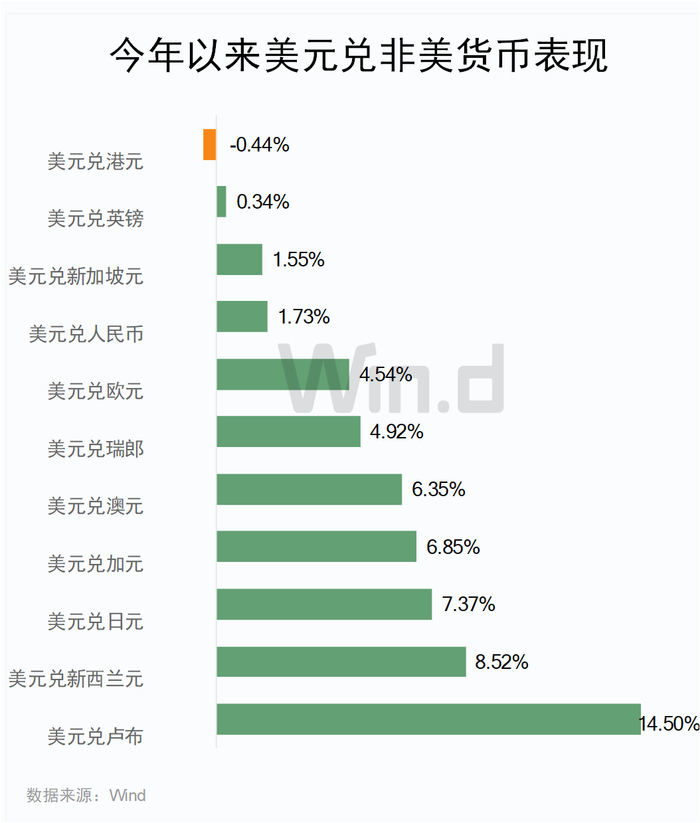 以美元兑非美货币今年表现来看,截至12月11日午间,Wind数据显示,11种货币仅港元兑美元逆市上涨升值,其余10种货币兑美元均下跌即贬值。其中卢布贬值最大,美元兑卢布上涨14.5%(即卢布下跌14.5%),紧随其后新西兰元、日元、加元和澳元相对于美元均大幅下跌超过6%。而英镑、新加坡元和人民币较强劲,相对于美元仅小幅下跌在2%以内。加上港元,可称为2024年非美货币中最抗跌的四大货币。