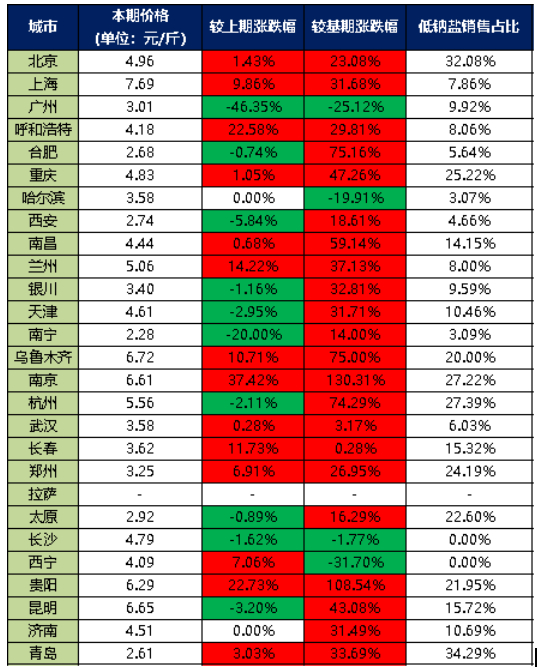 分价格区间来看,本期超市食用盐销售单价在5元/斤以上的城市有7个,分别是上海、兰州、乌鲁木齐、南京、杭州、贵阳、昆明;超市食用盐销售单价在4-5元/斤之间的城市有8个,分别是北京、呼和浩特、重庆、南昌、天津、长沙、西宁、济南;超市食用盐销售单价在3-4元/斤之间的城市有6个,分别是广州、哈尔滨、银川、武汉、长春、郑州;超市食用盐销售单价在3元/斤以下的城市有5个,分别是合肥、西安、南宁、太原、青岛。