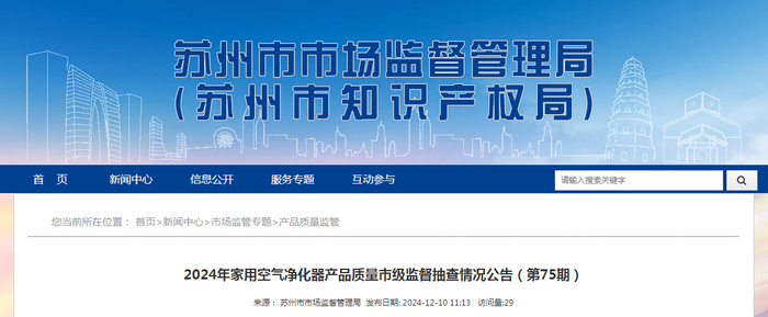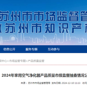江苏省苏州市市场监督管理局发布2024年家用空气净化器产品质量市级监督抽查情况公告(第75期)