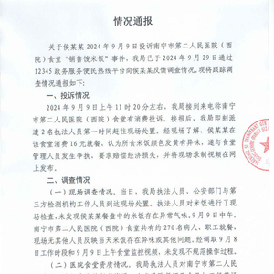 12月11日12时42分,南宁市江南区市场监督管理局于官网发布《情况通报》,公布侯某某投诉南宁市第二人民医院(西院)食堂“销售馊米饭”事件调查结果。通报称,江南区市场监督管理局抽样送检了食堂仓库内的大米,检测机构于9月12日出具检验报告,检验结论为符合相关食品安全标准。