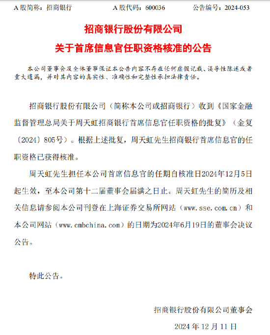 12月11日金融一线消息,招商银行今日发布关于首席信息官任职资格核准的公告称,公司收到《国家金融监督管理总局关于周天虹招商银行首席信息官任职资格的批复》,周天虹招商银行首席信息官的任职资格已获得核准。周天虹担任公司首席信息官的任期自核准日2024年12月5日起生效,至公司第十二届董事会届满之日止。