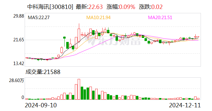 中科海讯(SZ300810,收盘价:22.63元)12月11日晚间发布公告称,公司第三届第三十次董事会会议于2024年12月11日在公司会议室以现场结合通讯方式召开。审议了《关于召开2024年第三次临时股东大会的议案》等。
