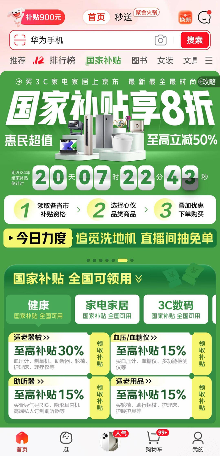 今年“双 12”与往年不同,“以旧换新”补贴刺激了不少消费者的购物欲。针对家电“以旧换新”补贴,淘宝双12继续提供线上消费入口。京东首页醒目位置设置了“国家补贴”入口,点进去可见距2024年结束补贴动态倒计时,以及“各省直通一键直达”入口,大促紧张氛围感拉满。