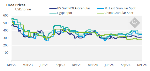 印度今年进行了6次尿素招标,采购总量为420万吨。2023年进行了5次招标,采购量为560万吨。自10月中旬以来,受购买力不佳和季节性低迷的影响,全球尿素价格一直呈下降趋势。然而,印度的预期消息刺激了市场,北非尿素价格在24小时内飙升了12美元(吨价,下同),埃及最新价格也达到371美元。