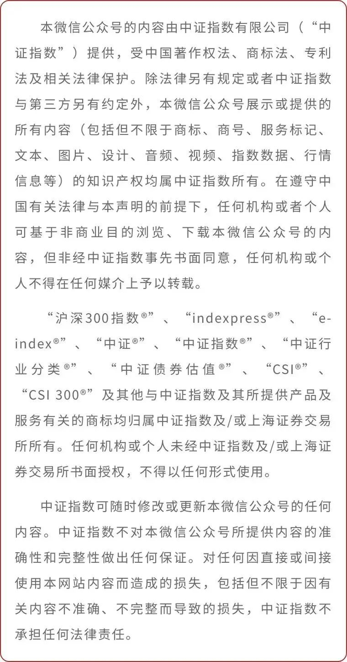 本声明不代表中证指数就中证指数本身享有的任何合法权利或权益的放弃。“沪深300指数®”、“indexpress®”、“e-index®”、“中证®”、“中证指数®”、“中证行业分类®”、“中证债券估值®”、“CSI®”、“CSI 300®”及其他与中证及其所提供产品及服务有关的商标均归属于中证指数及/或上海证券交易所所有。任何机构或个人未经中证指数及/或上海证券交易所书面授权,不得以任何形式使用。