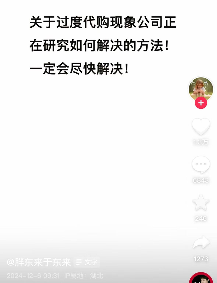 12月6日,于东来发文称关于过度代购现象,公司正在研究如何解决的方法!一定会尽快解决!