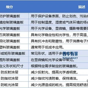 玻璃盖板按用途分类,可分为防护玻璃盖板、环境控制玻璃盖板、光学玻璃盖板;按材料分类,可分为石英玻璃盖板、钢化玻璃盖板、塑料玻璃盖板;按形状和尺寸分类,可分为方形或矩形玻璃盖板、圆形玻璃盖板、自定义形状和尺寸;按特性分类,可分为防反射涂层、防指纹涂层、防眩光涂层。