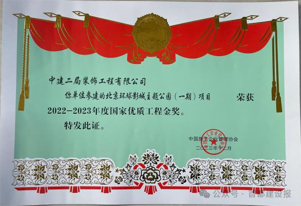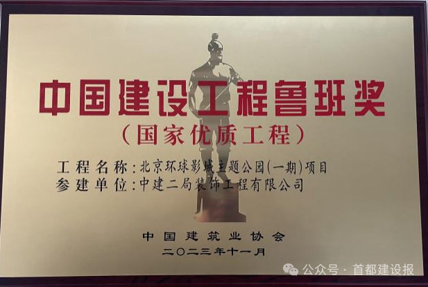 北京环球影城项目获得2022-2023年度国家优质工程金奖、2022-2023年度第一批中国建设工程鲁班奖、2022年度中国建筑装饰工程奖、2022年度住建部绿色施工科技示范工程、2021-2022年度北京市建筑长城杯金质奖工程、2020年QC小组国家级Ⅲ类成果、公司2019年度品牌贡献奖。