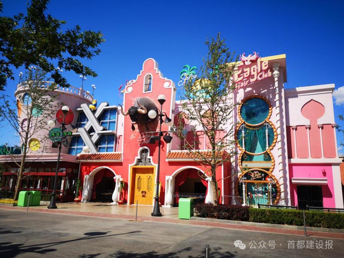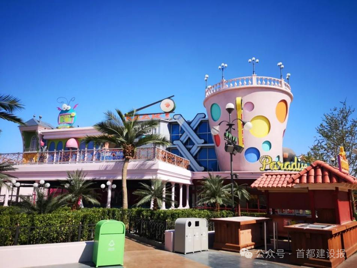 其中,粉红色“奶昔杯”和红色“牛头墙”颜值颇高,置身其中,仿佛来到了电影奇幻世界。为打造沉浸式娱乐体验,项目部主题雕刻艺术班组既要将电影《神偷奶爸》中卡通人物居住的房子复刻到现实世界,还要考虑人眼观感的舒适度。这就需要在面积最大、最显眼的墙面颜色上突破。