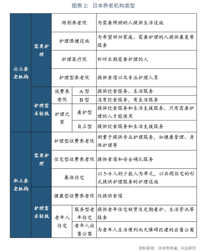 从养老机构类型来看,公立养老机构按护理程度及服务需求分为两大类、八小类。一是面向需要护理的人群:特别养老院,为需要照顾的人提供生活设施;护理保健设施,为希望回归家庭、需要护理的人提供康复等服务;护理医疗院,针对需要长期护理的人;护理型养老院,提供食宿以及专业护理人员。二是面向不太需要护理的人群:低费养老院 (A型B型),是指免费或低价收容老年人,并为他们提供膳食和其他日常生活必需设施的设施;护理之家,按护理程度又分为看护型和自立型,提供膳食等基础养老服务。私立养老机构按护理程度及服务需求分为两大类、六小类。一是面向需要护理的人群:护理型收费养老院,侧重于提供专业护理服务,如健康管理、身体护理等;住宅型收费养老院,提供食宿和安全确认服务;集体住宅,以5~9人的少数人为单元,以共同住宅的形式提供护理服务的护理设施。二是面向不太需要护理的人群:健康型收费养老院,仅提供食宿;老年人住宅,包括服务型老年住宅与老年人的出售公寓,服务型老年住宅提供老年住宅租赁及定期看护、生活资讯等服务;面向老年人的出售公寓,主要为无障碍改建的出售公寓。