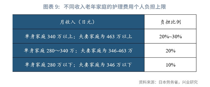 第二,日本长期护理保险资金承担了老年家庭养老护理支出的主要费用,老年家庭对于长期护理保险的依赖度也较高。从制度安排来看,根据收入界定护理费用负担比例,个人承担比例在10%至30%之间,剩下70%至90%的费用则由护理保险财源支出。保险支付费用通常按实际护理费用支付,但会根据需要支持和护理的程度划分为七个等级,分别规定上下限额,最低限额为每月5.0万日元,最高可至36.2万日元,超出部分需要居民自费。每月使用者承担的费用(不包括购买福利用具的费用、餐费、住宿费等部分)的总和,若超出了上限金额,超出的部分将由护理保险支付(但需向市政府申请付款)。如果家庭同时缴纳医疗保险和长期护理保险,则综合支付费用也会减少。