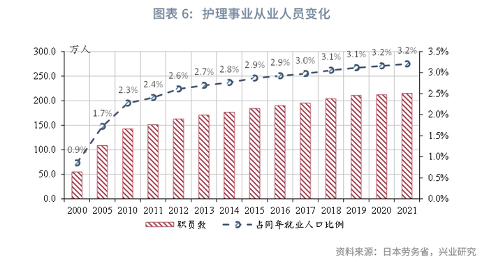 从业人员数量上,呈逐年递增趋势。2021年护理事业从业人员规模为214.9万人,相较长期护理保险制度起始的2000年,从业人员数量增长了3.9倍。从业人员与同期就业人口(口径说明)的比重也呈上升趋势,由2000年的0.9%上升至2021年的3.2%,自2017年突破3.0%后,仍保持缓慢上升趋势。
