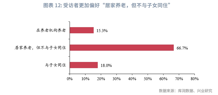 2015年第四次中国城乡老年人口生活状况抽样调查数据显示,95.6%老年人的主要照料者为家人,2.8%老年人的主要照料者为保姆、小时工等家政人员,二者比例相加高达98.4%,这意味着居家养老是中国绝大多数老年人的选择。根据中国老龄产业协会组织撰写的《中国居家养老产业发展白皮书(2021-2022)》调研统计,截至2021年底,我国入住养老机构的老年人不足老年人口总量的1%。[6]根据兴业研究2024年委托开展的调查,受访者最期望的养老方式为“居家养老,但不与子女同住”,占比达66.7%;其次是“与子女同住”,占比为18%;“在养老机构养老”占比最低,为15.3%。其中,高收入受访者希望“在机构养老”的占比相对较高,达21.8%;中等收入受访者更加“居家养老,但不与子女同住”占比相对较高,达68.3%;低收入受访者希望“与子女同住”占比达22.8%。