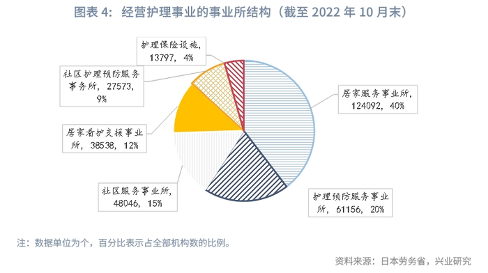 顺应三种不同的养老模式,日本护理事业机构发展较为成熟。机构数量上,截至2022年10月,共计31.32万个机构,十年年均增速2.3%。机构数较多的三大类型为:一是居家服务事业所(12.4万个;占比40%),其中,机构数较多的是上门护理(3.64万个)、日常看护(2.46万个)、上门护理站(1.48万个)。二是护理预防服务事业所(6.12万个;占比20%),其中,机构数较多的是护理预防上门护理站(1.44万个)、护理预防短期入住生活护理(1.13万个)。三是社区服务事业所(4.80万家;占比15%),其中机构数较多的是社区日常看护(1.94万个)、痴呆症对应型社区生活护理(1.41万个)。