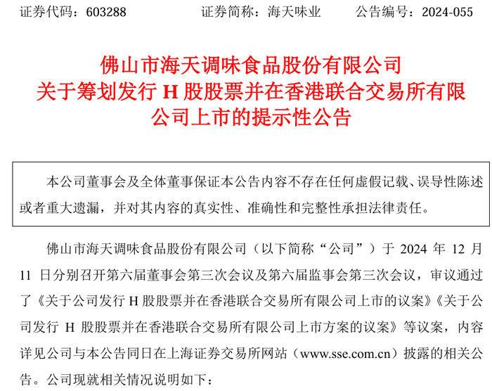 被誉为 “酱油茅” 的海天味业(603288.SH)于12月11日晚公告,公司拟发行H股股票并申请在香港联交所主板挂牌上市。据悉,此次上市旨在进一步推进全球化战略,提升国际品牌形象和综合竞争力。