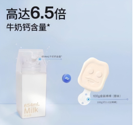 标称为“奶酪博士金装棒棒”宣称6.5倍牛奶钙含量,实测结果582mg/g,约5.4倍牛奶钙。