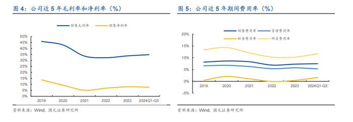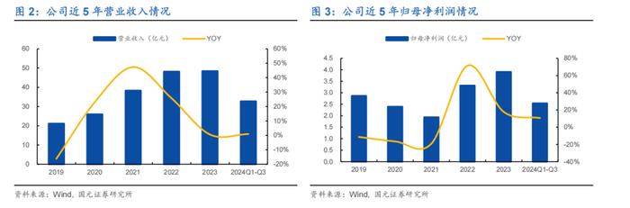 公司营业收入稳健,整体呈现上升态势。2019-2023年,公司营业收入实现从21.1亿到48.4亿的高增长,CAGR为23.1%,2023年公司营业收入48.4亿元,同比增长 0.6%,公司收入端稳健增长。2024年Q1-Q3实现营业收入32.74亿元,同比增长0.91%,增长整体稳健。公司2019-2021年归母净利润逐年减少,2022年归母净利润实现3.31亿元,盈利能力有所提升,2023年3.90亿元,同比增长17.79%,开始稳中向好。2024年Q1-Q3实现归母净利润2.54亿元,同比增长10.61%,发展态势良好。