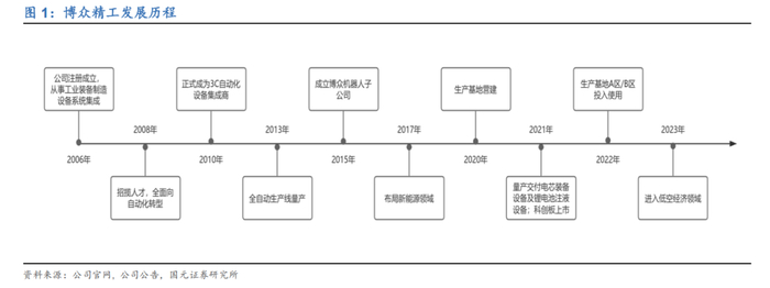 深耕工业装备制造,专注研发和创新。博众精工是一家专注于研发和创新的技术驱动型企业,自2006年创立以来,深耕智能制造装备领域,主要从事自动化设备、自动化柔性生产线、自动化关键零部件以及工装夹具等产品的研发、设计、生产、销售及技术服务。2006年至2017年公司专注于3C产业,2017年后公司基于原有3C业务的基础之上,积极向半导体、汽车电子、新能源、低空经济等行业进行业务拓展和延伸,构建多元领域布局,提升公司竞争力。