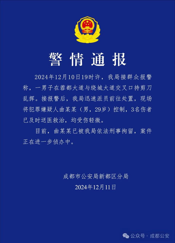·男子成都街头持剪刀伤人,警方:3人受伤,嫌犯已被刑拘。