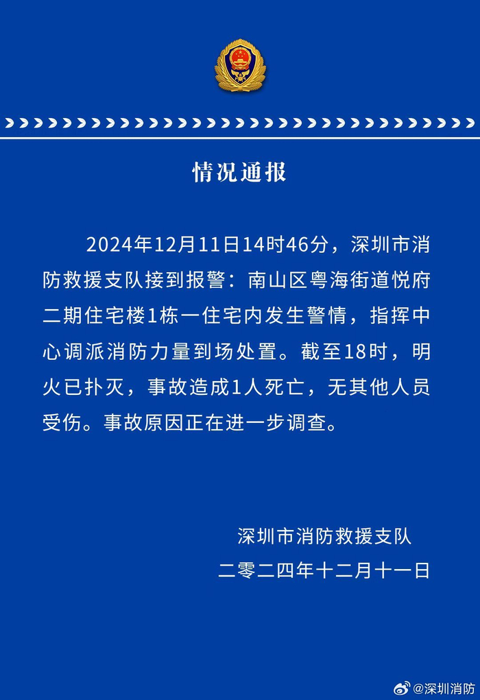 ·深圳消防通报南山区住宅楼火灾:明火已灭1人死亡,事故原因正调查。