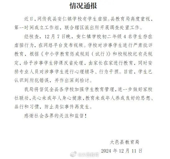·成都4名中学生组团虐猫,官方:严肃批评教育,停课反省。