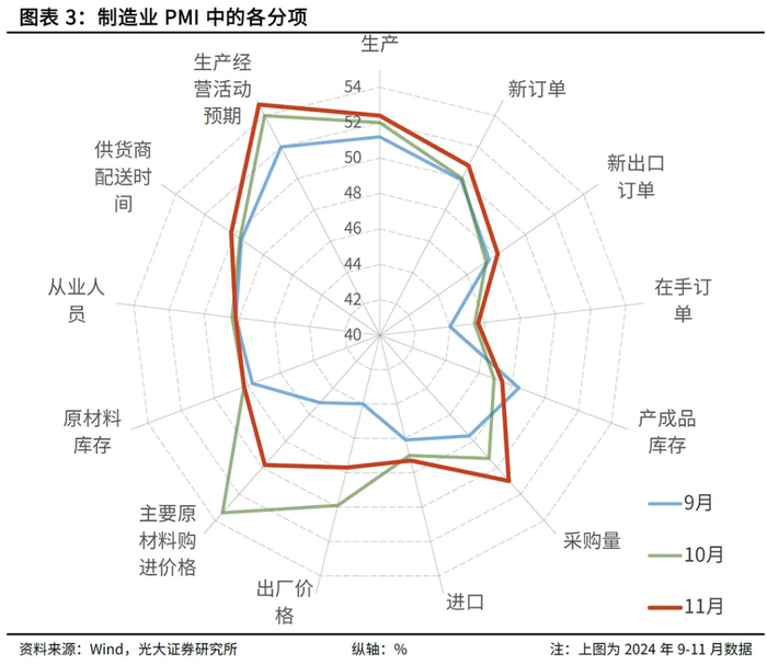 从中长期来看,债券的走势主要由投资者对于货币政策和经济基本面的预期所决定,且经济基本面还是货币政策最根本的影响因素。近段时间以来,经济运行状况以及市场主体的预期已较7、8月有所改善。例如,至11月制造业PMI已连续三个月上升,且后两个月皆处于扩张区间(即50%以上)。再如,11月制造业PMI中生产经营活动预期指数为54.7%,已连续两个月回升,表明多数制造业企业对未来市场信心有所增强。另如,今日上证指数收于3432.49点,已较11月28日收盘价上涨了4.15%,反映出资本市场投资者对于经济预期的升温。