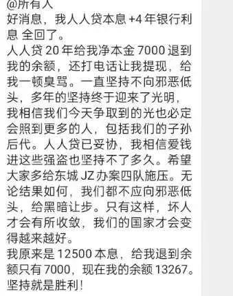 一位出借人说,“我人人贷本息 +4年银行利息 全回了。人人贷20年给我净本金7000退到我的余额,还打电话让我提现,给我一顿臭骂。一直坚持不向邪恶低头,多年的坚持终于迎来了光明我相信我们今天争取到的光也必定会照到更多的人,包括我们的子孙后代。人人贷已妥协,我相信爱钱进这些强盗也坚持不了多久。希望大家多给东城 JZ办案四队施压。无论结果如何,我们都不应向那恶低头,给黑暗让步。只有这样,坏人才会有所收敛,我们的国家才会变得越来越好。我原来是12500本息,给我退到余额只有 7000,现在我的余额13267.坚持就是胜利!”