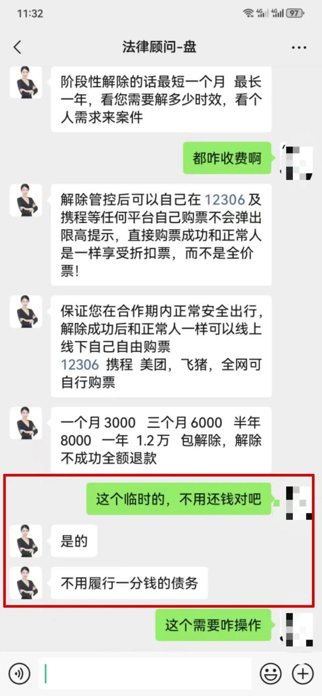 另一个自称收到后台留言的“法律顾问”主动向北青报记者发来好友申请,并表示可以提供“解限”服务。该视频号客服表示:“可让被执行人坐飞机走人工通道,正常值机,还可以出国,海关不拦截。飞机折扣票、高铁一等座、国际航班、飞机头等舱,随时买随时走。”他们的“解限”服务报价为:一个月3000元、三个月6000元、半年8000元、一年1.2万元。