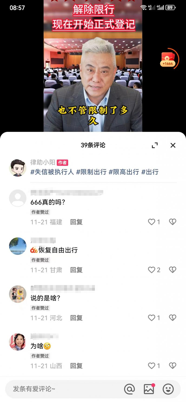 近日,北京青年报记者发现短视频平台频出“限高令新政”的相关视频,称“有内部途径,被限制高消费人员不用还款也能正常买机票、高铁票。”视频发布者中,不乏有被认证为律所及法律咨询公司的账号。北青报记者调查发现,这些所谓的“工作人员”普遍套用了两三层不同身份,打着普法视频的幌子,向被限高的被执行人宣传自家的买票服务。尽管每条视频发布几个小时后便会删除,但下方评论仍有近百人留言咨询。