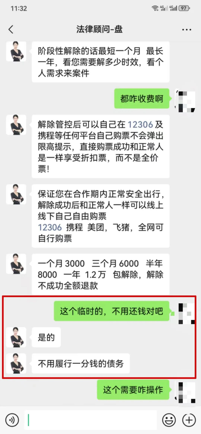 另一个自称收到后台留言的“法律顾问”主动向北青报记者发来好友申请,并表示可以提供“解限”服务。该视频号客服表示:“可让被执行人坐飞机走人工通道,正常值机,还可以出国,海关不拦截。飞机折扣票、高铁一等座、国际航班、飞机头等舱,随时买随时走。”他们的“解限”服务报价为:一个月3000元、三个月6000元、半年8000元、一年1.2万元。