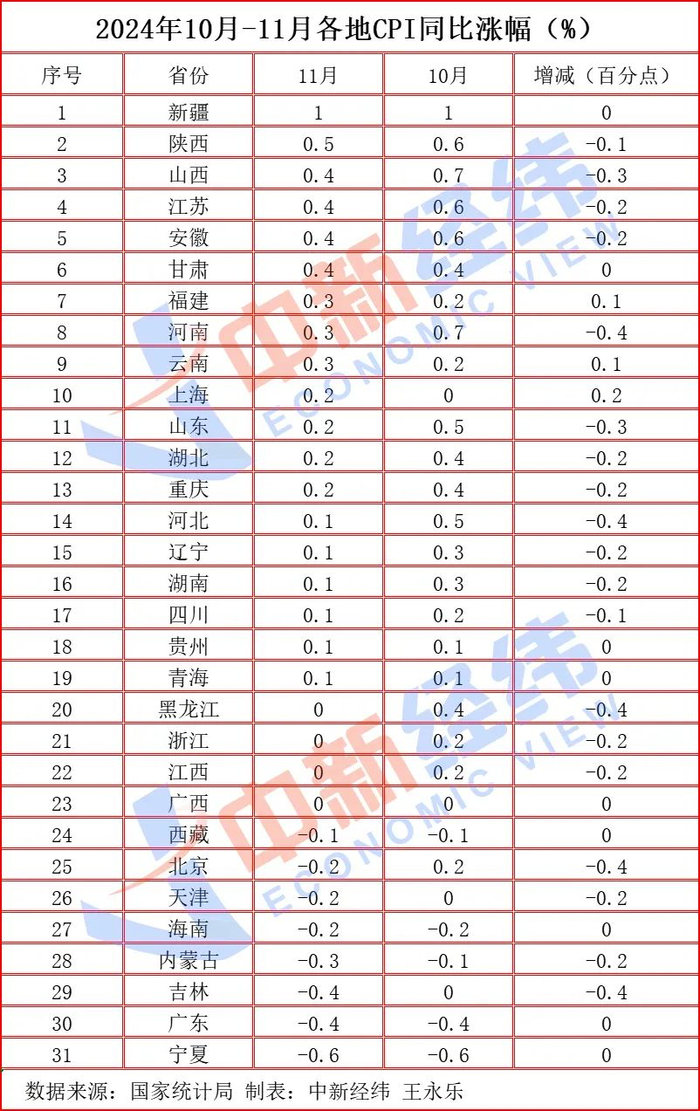 日前,国家统计局公布了31省份2024年11月居民消费价格指数(CPI)。中新经纬梳理发现,11月,19省份CPI同比上涨。