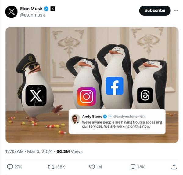 值得注意的是,Meta并不是第一次发生如此大规模的宕机了,在今年3月份也曾发生过一次,当时也是Facebook、Instagram、Threads全部阵亡,经历了大约两小时的中断,当时还被马斯克发文调侃。