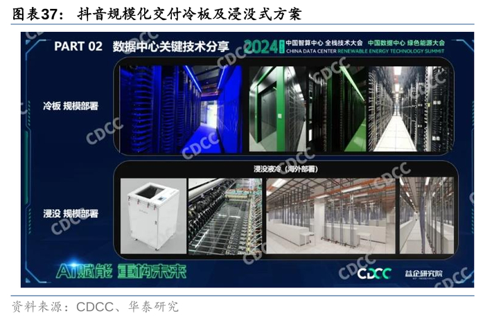 国内市场方面,电信运营商及互联网大厂齐发力,推进液冷技术应用落地。电信运营商方面,2023年6月《电信运营商液冷技术白皮书》发布,白皮书提出三年发展愿景,2023年开展技术验证,形成解耦标准;2024年进行规模化试验,新建项目10%规模试点液冷技术;2025年及以后,50%项目规模化应用液冷技术,在此愿景下,我们观察到2024年电信运营商开展多个液冷项目招标工作,例如,中国电信在上海临港投资建设了国内首个国产单池万卡液冷算力集群, 此外,在京津冀、粤港澳大湾区也均有液冷算力中心陆续投产。展望2025,电信运营商将实现液冷技术规模化应用,招标及需求量有望进一步提升。互联网方面,据抖音数据中心技术专家赵峥2024年7月在CDCC上的演讲,抖音在冷板及浸没液冷技术方面已经实现了大规模交付,冷板技术从国内到海外已交付100MW的规模,浸没液冷技术目前也已经交付了超过10MW的水平。