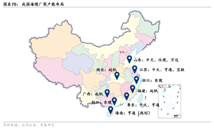 海底电缆竞争壁垒高、格局稳定,关注行业龙头发展机遇。海底电缆行业的竞争壁垒主要体现在三个方面:1)生产技术门槛高:海底电缆相较于陆地电缆,在防腐蚀、机械强度、绝缘处理和生产难度上有着更高的要求,并对生产工艺、敷设安装、运行维护等技术有极高的要求,仅少数厂商具备330kv以上高电压海缆批产能力。2)资质与历史业绩壁垒高:业主方在进行海缆招标时会明确要求供货商的资质和历史业绩要求,由于海缆维修和更换成本高、难度大,可靠性和安全稳定性是关注重点,对于新进入者来说形成较大障碍。3)产能布局和资源壁垒:海缆区域属性强,政府希望能够将海缆订单放在本地生产以带动当地经济发展,同时海缆产能扩建涉及土地、厂房、设备、码头等高昂固定资产投资,产能扩建具有较高门槛。目前,我国海底电缆第一梯队厂家合计市场份额超过85%,并逐步开拓海外市场,有望充分受益海上风电行业快速发展。