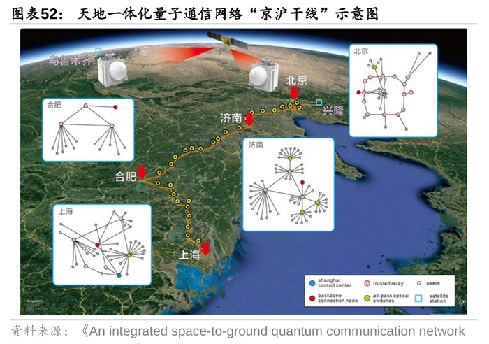 得益于量子通信的无条件安全性,军事国防、金融、政务、互联网云、电力等多领域已实现产业化应用。量子通信的发展路线是先通过光纤实现城域的量子通信,再通过中继器建立城际的通信网络,最后通过卫星中转实现网络达不到的远距离量子通信。我国已有公司对量子通信进行专门的研究,如国盾量子、问天量子、启科量子等。