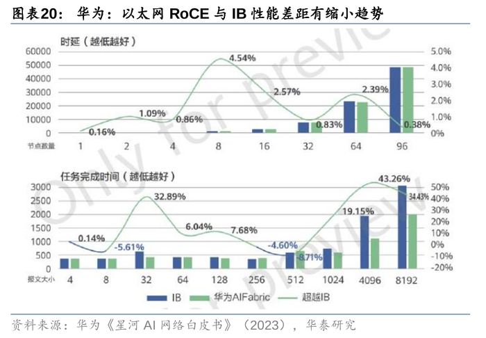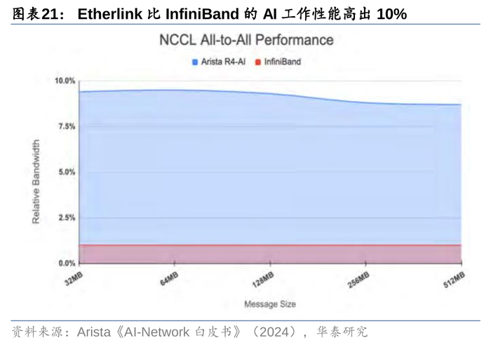1)性能提升,以太网与IB在AI组网中性能的差距有望缩小,如华为在武汉人工智能计算中心网络部署前进行对比测试,在MPI、Benchmark等典型应用测试中,华为RoCE的网络性能与IB网络整体基本持平,同时海外方面,经测试在相同的Message Size条件下,Arista新发布的Etherlink比InfiniBand的AI工作负载性能高出10%;