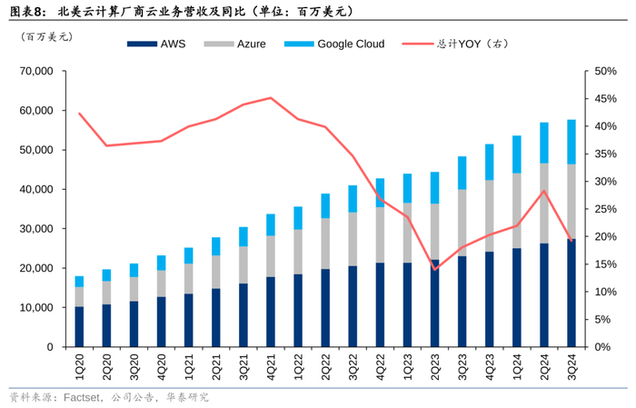 3Q24北美三大云厂商营收持续增长。海外市场方面,根据我们对亚马逊、谷歌、微软等云厂商的财报梳理,3Q24北美三家云厂商云计算业务合计营收达到576.9亿美元,同比增长19.3%。其中3Q24亚马逊AWS/微软Azure/谷歌云营收同比增速分别为19.1%/33.0%/ 35.0%,相较2Q24,3Q24亚马逊AWS同比增速提升0.35pct,微软Azure同比增速下降1.00pct,谷歌云同比增速提升6.14pct。展望未来,受益于AI驱动,AIGC应用带来的训练和推理需求长期仍将在云端进行,未来随着AI应用商业化的持续落地,推理需求有望超过训练需求,而小批量、多批次的灵活云上推理更加契合未来大模型推理的需求。