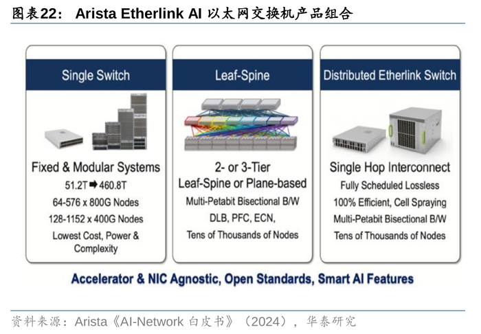 3)海外巨头引领,24年以来海外巨头相继拥抱AI以太网,具体而言:a.长期以InfiniBand为主要技术路径的英伟达在1Q24业绩会中表达对其以太网方案Spectrum-X的高度重视,并称该产品的收入规模有望在一年内增长至数十亿美金;b.博通在1Q24业绩会中表示全球最大的8个AI集群中有7个部署了博通的以太网解决方案,25年将会有更多的超大规模集群部署在以太网上;c.Arista亦发布全新的以太网交换机平台Etherlink AI,支持UEC协议的同时规模组网能力显著增强,最高支持数十万卡互联。