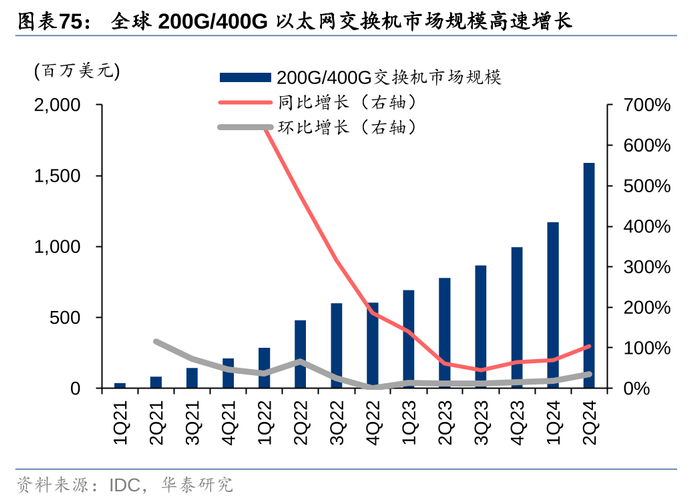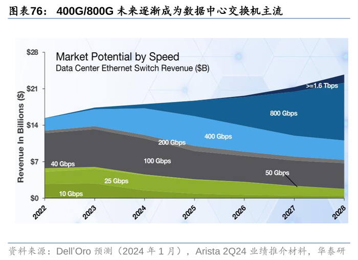 1)高速化:端口速率是以太网芯片的每个端口每秒钟传输的最大bit数量,是衡量芯片性能的重要指标。根据IDC数据,2Q24全球200G/400G以上交换机销售合计收入达到15.9亿美元,同比提升104%,环比提升36%,相比1Q22 2.9亿的水平已增长454%,展现出市场因AI智算中心建设对高速数据中心交换机的强劲需求。根据Dell’Oro在2024年1月的预测,2025年以后400G/800G将逐渐成为数据中心交换机主流,25年400G/800G合计占比有望接近市场的一半,26年以后800G交换机占比将继续提升,成为第一大需求,届时也有望开始出现1.6T的市场需求,至28年高速数据中心交换机总市场有望超过210亿美元。