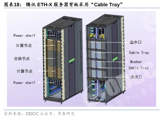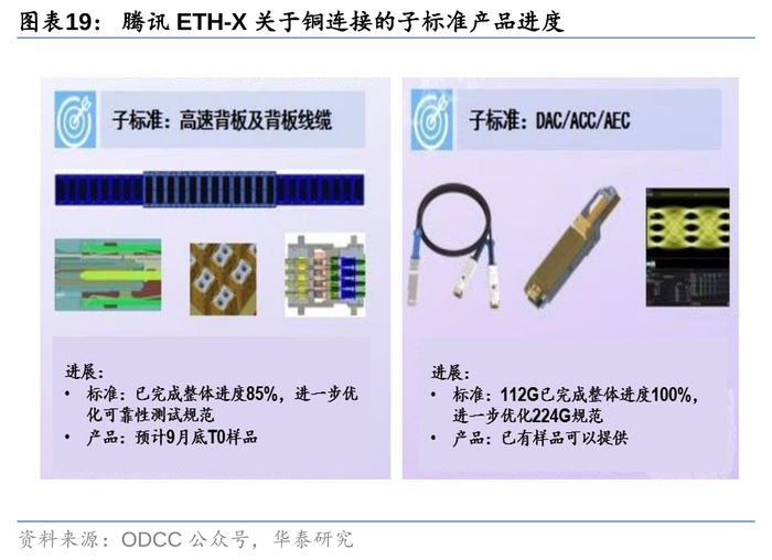 国内:腾讯ETH-X概念机柜采用背板铜互联,国产服务器亦有望采用铜互联方案。根据ODCC公众号,9月4日2024开放数据中心大会网络论坛中,腾讯网络首席架构师夏寅贲介绍了其ETH-X超节点项目的设计进展,我们从框架图中看到,ETH-X服务器参考了英伟达GB200 NVL72中的设计,如机柜从上至下依次为计算节点-交换节点-计算节点,对应NVL72中从上至下的Compute Tray-NVSwitch Tray-Compute Tray,因而其背板亦使用“Cable Tray”的高速铜缆连接,目前已可保证超节点系统的硬件可由不同专业领域厂家独立研发生产,以及保证了各个子系统硬件的可集成互通,但仍面临集成测试、系统运维、协议设计、业务测试等一系列的技术挑战。展望未来,我们看好英伟达GB200服务器理念的拉动作用,国内更多的算力参与方有望在AI服务器的设计中加入铜连接的元素。