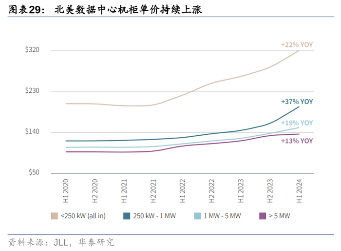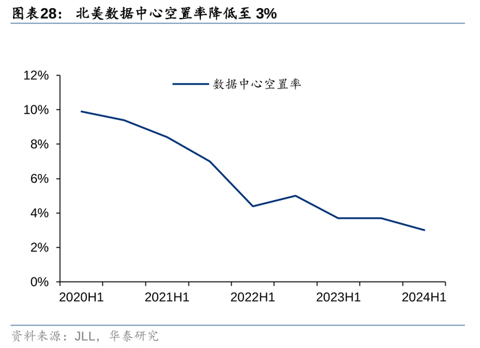 在AI需求高速增长的海外市场,数据中心行业已进入“快速扩张”的高景气周期,单机柜租金及机柜利用率持续上涨。据JLL统计,截止2024H1,美国在运营数据中心总容量为12GW,较2020年在运营容量增长一倍,CAGR达到21%。而与此同时,美国正在建设/计划建设的数据中心容量分别达到5.3GW/22GW,当前的数据中心产能供给无法满足日益增长的AI对基建的需求,在此背景下,截止1H24,美国数据中心的空置率进一步下降至3%,各类机柜的租金均有较为明显的上涨。