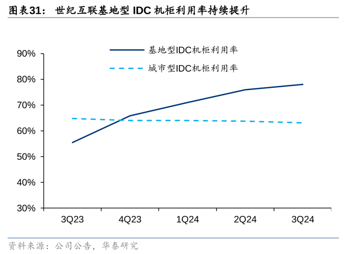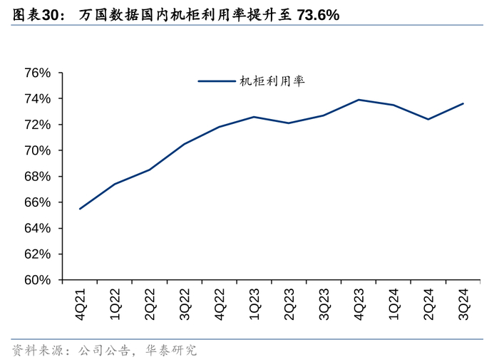 国内数据中心行业供需拐点持续验证。据公司3Q24业绩材料,万国数据国内机柜利用率已提升至73.6%,世纪互联基地型IDC机柜利用率提升至78%,城市型IDC机柜利用率为63%,基本保持稳定。我们认为万国数据/世纪互联作为国内头部第三方IDC厂商,其机柜利用率提升表明国内市场供需格局已呈现逐步好转的迹象,此外,据公司3Q24季报披露,3Q24万国数据在北京及廊坊地区新获取55.6MW的订单,3Q24世纪互联新签约订单量达到84MW,由AI带动的新增数据中心需求正在持续释放中。