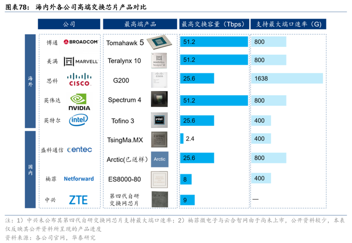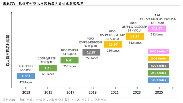 AI数据中心引领下,交换芯片持续向“高速化”、“大容量化”升级:
