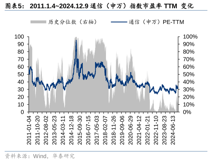 根据我们对公募基金2024年三季报的统计,3Q24末公募基金前十大重仓中通信板块A股持仓占比3.81%,较4Q23末提升1.36pct;3Q24板块超配比例为1.39%,较4Q23末提升1.27pct。与4Q23相比,公募基金加仓光模块、海缆、云办公终端、港股运营商等板块,减仓军事通信等板块。估值层面,2024年12月9日通信(申万)市盈率TTM为32.11x,系2011年初至今13.20%历史分位数。