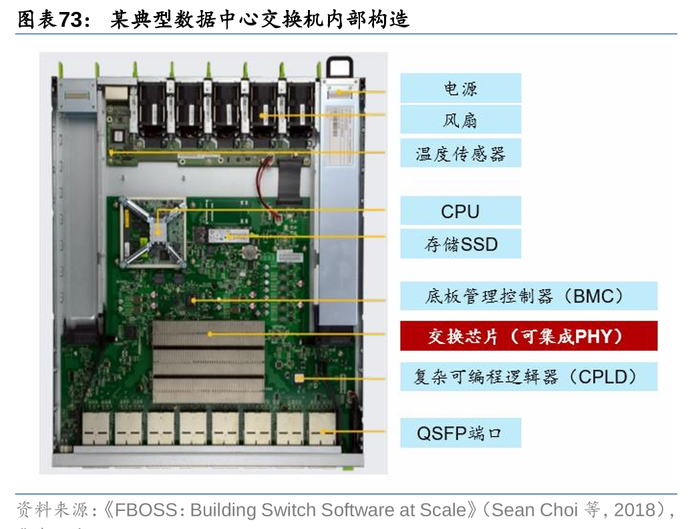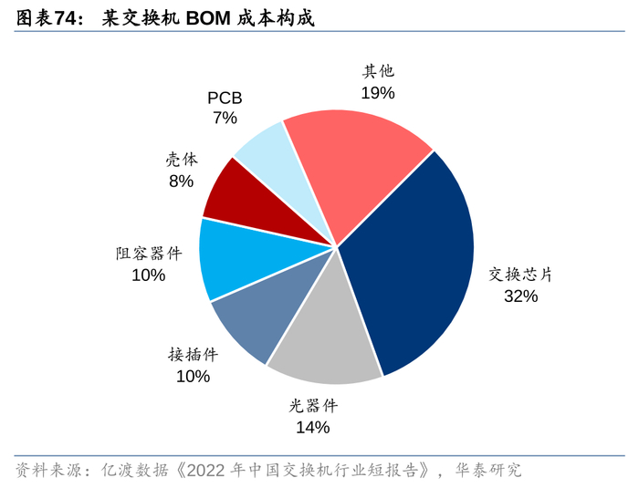交换芯片是交换机的核心元器件,BOM成本占比约30%。从某交换机的BOM成本构成来看,交换芯片为最核心的元器件,成本占比达到32%,交换芯片是用于交换处理大量数据及报文转发的专用芯片,是针对网络应用优化的专用集成电路(ASIC)。以太网交换芯片内部的逻辑通路由数百个特性集合组成,在协同工作的同时保持极高的数据处理能力,因此其架构实现具有复杂性,CPU是用来管理登录、协议交互的通用芯片,PHY芯片用于处理电接口的物理层数据,CPU和PHY都可集成在交换芯片中。此外光器件、接插件、阻容器件、PCB等重要元器件分别占14%/10%/10%/7%。
